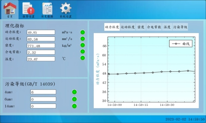 本軟件為“在線油液質量監(jiān)測系統(tǒng)”,用于實時監(jiān)測油液的各種油品狀態(tài)指標,如動力粘度、運動粘度、密度、介電常數(shù)、溫度、污染度,以曲線圖規(guī)律性展示,并記錄保存,給用戶對油液的狀態(tài)提供參考。